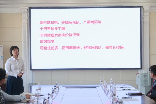 李艳华教授就丁香叶子宫灌注剂、车前草超微粉、余甘子颗粒剂及复方中兽药超微粉等在母猪-仔猪一体化中的产品开发进行了推介。