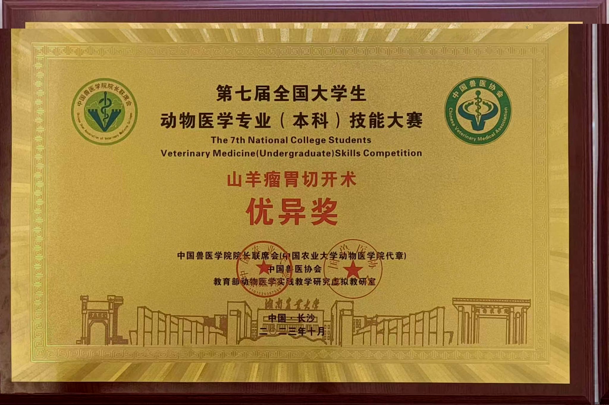 10月21日—24日,第七届全国大学生动物医学专业(本科)技能大赛在长沙举行。本次大赛由中国兽医学院院长联席会、中国兽医协会主办,湖南农业大学承办,共有来自全国72所高等农林院校的参赛者们同台竞技、一展风采。经过激烈角逐,我校必威西汉姆官网平台本科学生侯佳荣、孙超、袁世豪、刘睿婷在比赛中发挥出色,斩获技能大赛团体“特等奖”和“山羊瘤胃切开术单项优异奖”。