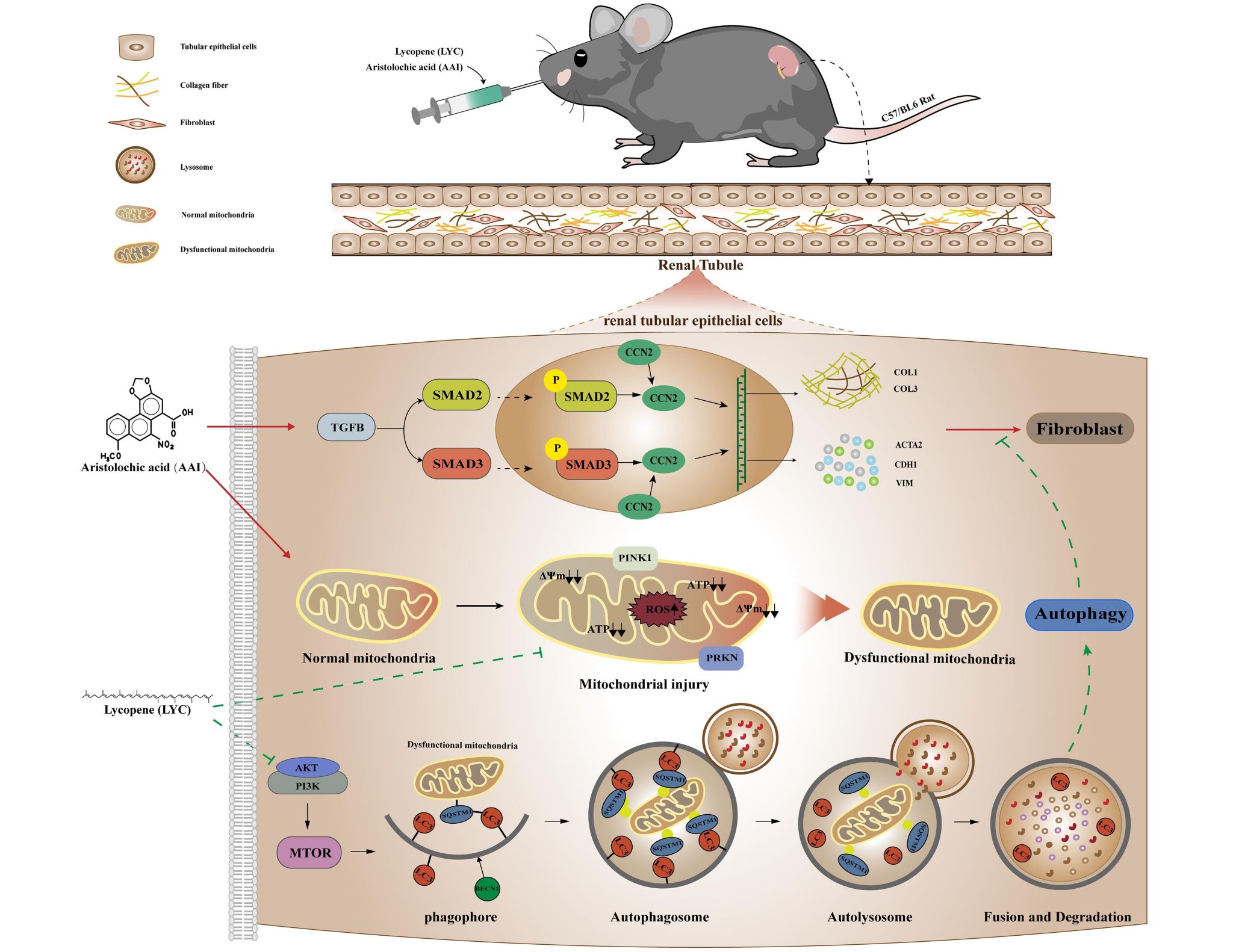 本研究发现,长期灌服马兜铃酸I(AAI)后小鼠肾脏发生纤维化,肾小管上皮细胞中蓄积大量损伤的线粒体。通过筛选发现番茄红素(LYC)能够减缓小鼠肾纤维化。我们推测LYC可能通过调控线粒体自噬缓解肾纤维化。本研究对LYC作用靶点和通路进行GO通路和KEGG通路富集分析,结果显示Autophagy– animal的富集程度值排列在第三位。同时在体试验发现LYC的干预减轻线粒体损伤,促进Pink1/Parkin的表达,募集自噬通量蛋白LC3Ⅱ/P62在线粒体外膜的表达,使线粒体膜电位下降,上调自噬通量,并抑制TGF-β/Smad-2/Smad-3的表达,从而改善肾脏纤维化。在体外试验中,应用自噬抑制剂(Baf-A1和CQ)干预NRK52E细胞时,细胞内LC3Ⅱ的表达显著升高。CQ的作用能够减弱LYC对TGF-β信号通路的抑制作用。LYC基因标靶与“Autophagy”相关基因的交集进行拓扑分析后,发现LYC调控细胞自噬与AKT信号通路密切相关,分子对接表明LYC与AKT稳定结合。使用AKT抑制剂(GSK-690693)和AAI同时干预细胞,激活细胞自噬,抑制肾脏细胞上皮间质转化(EMT)。然而加入AKT激动剂(SC79)后,阻断LYC激活线粒体自噬和抑制EMT的作用。本研究表明LYC通过抑制AKT信号通路,促进线粒体自噬小体向自噬溶酶体的转化,诱导吞噬损伤的线粒体,抑制TGF-β及其下游信号通路的转导,减缓EMT,维持细胞稳态,从而缓解肾脏纤维化。
