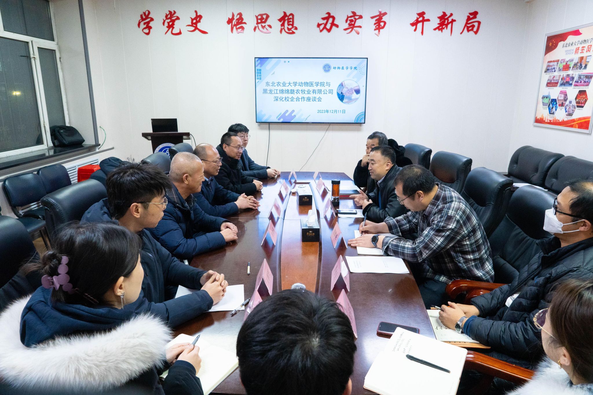 为加强企业主导的产学研深度融合,强化目标导向,提高科技成果转化和产业化水平,12月11日下午,我院与黑龙江绵绵瓞农牧业有限公司举行了深化校企合作座谈会,会议在牧医楼202会议室召开。北安市农业农村局一级主任科员吴金龙、北安市畜牧兽医服务中心主任冯利锐、黑龙江绵绵瓞农牧业有限公司总经理牟善勇,黑龙江省肉羊体系岗位专家赵树臣、动物临床教学医院院长郭梦尧、黑龙江省奶牛协同创新体系岗位科学家高明春及学院部分教师代表参加座谈。座谈会由必威西汉姆官网平台院长李金龙主持。
