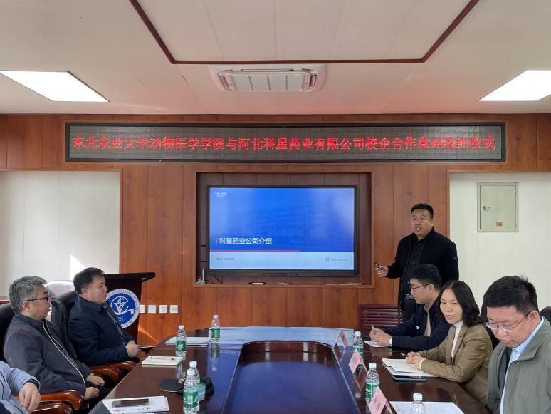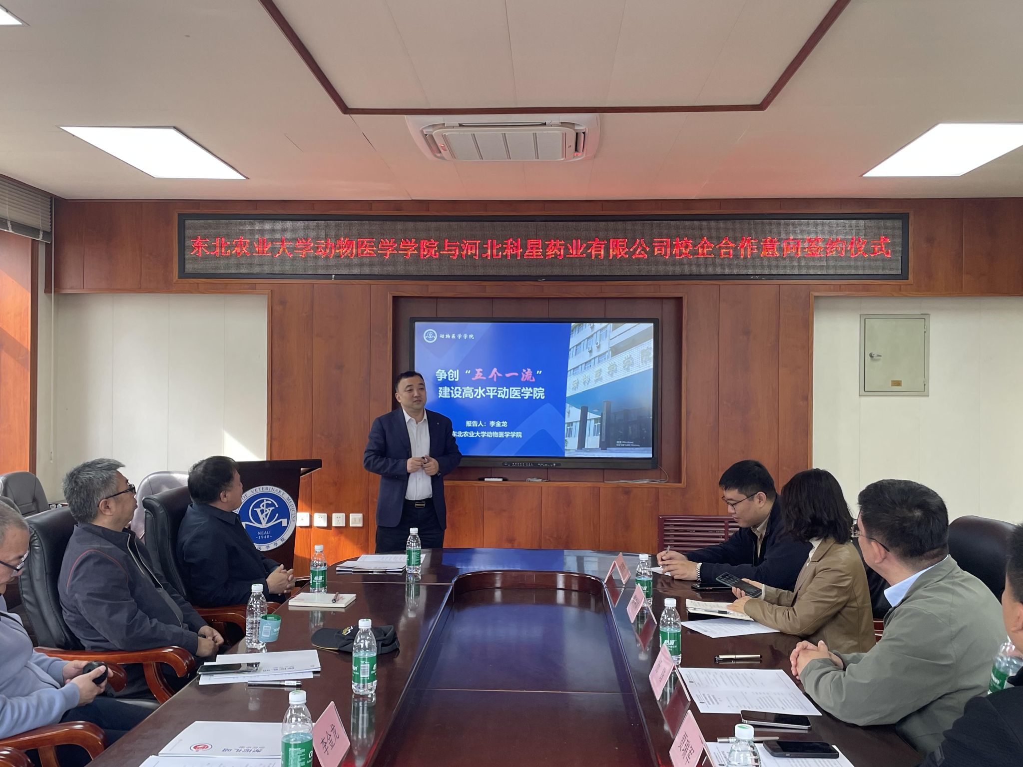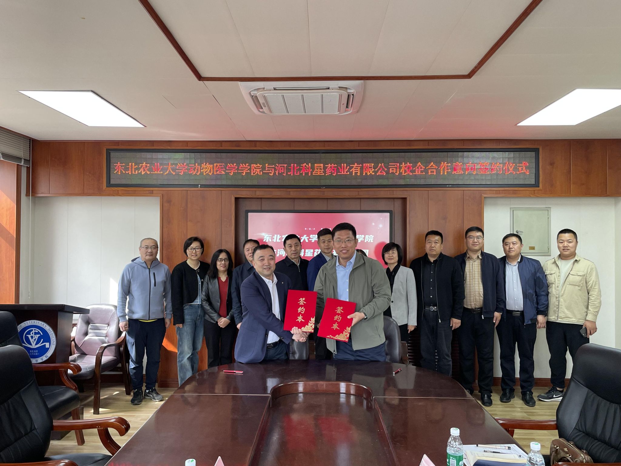 为了加速科学研究成果的转化应用,促进兽药领域的创新发展。4月28日,必威西汉姆官网平台与河北科星药业有限公司在我校举行校企合作意向签约仪式。bw必威西汉姆联社会合作与成果转化中心(新农村发展研究院)书记王伟峰,河北科星药业有限公司总经理杨锴、研发副总经理魏丽娟、畜药公司总经理贾瑞军、猪药东北大区经理苏景辉、黑龙江猪药销售经理张晓凯,必威西汉姆官网平台院长李金龙、副书记赵文和、教师代表李继昌、李艳华、宋铭忻、于文会、盛尊来、乔薪瑗出席了会议。签约仪式由李金龙主持。