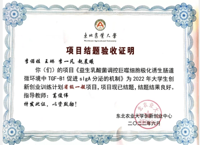 在科研方面,她在大一时加入学院微生物和免疫实验室进行科研实习,从事病毒检测和遗传多样性的分析,首次进行东北地区犬冠状病毒的流行调查,发现流行毒株的改变,并在中国东北地区内首次发现犬中的Cachavirus病毒,以第一作者身份发表SCI论文2篇;此外,她响应国家科研结果产业化的号召,投身到益生乳酸菌增强疫苗效果的研究中,在乳酸菌促进肠道sIgA分泌中的作用与机制,乳酸菌增强疫苗效果中的作用与机制方面依托项目支持取得系列进展,完成了国家级和省级创新训练项目各一项。并带领团队连续两年入驻bw必威西汉姆联创新创业中心(梦想小镇),进行成果转化方面的研究。