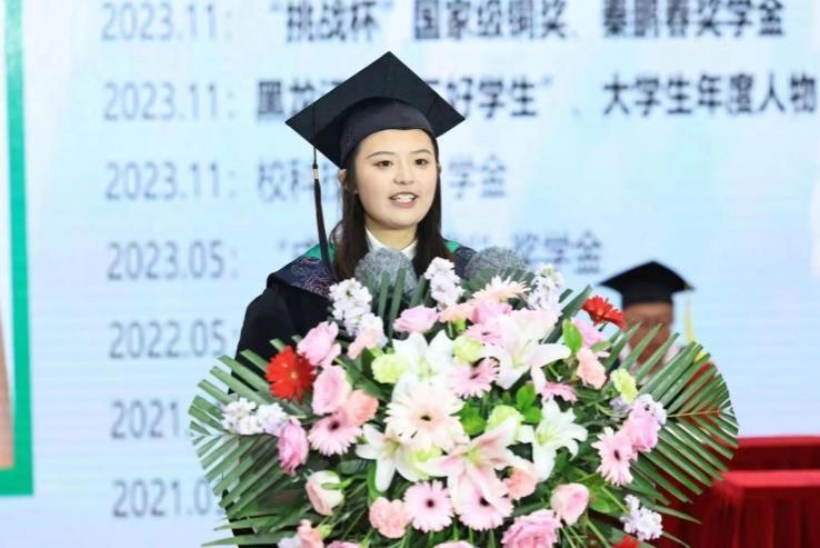 李诺娃代表全体本科毕业生对母校、师长、职工的培育和守护致以谢意和敬意。她分享了初至母校的青春记忆,并表示在五年的求学路上找到了属于青春这个谜题的三个答案。一是成长不凡。五年来,她见证了学校的飞速发展,也体会到了自己的成长与蜕变,在学生组织中崭露头角、在竞赛舞台上大放异彩、在志愿服务中奉献爱心、在科研工作中探索奥秘,成长不凡得益于东农这片沃土的滋养与哺育。二是传承不止。五年来,她谨记东农老一辈科研工作者的谆谆教诲,学农、知农、爱农,坚定信念,取得了丰硕的科研成果,并获得推免研究生资格,留在本校继续深造。她表示,作为东农学子,要厚植爱农情怀、苦练兴农本领,为农业插上科技的翅膀,为农业强国梦贡献自己的青春和智慧。三是追梦不停。五年来,母校教会了她坚持内心的宁静、坚定自己的热爱和坚守家国情怀的初心。未来,将继续秉承东农精神,挥洒汗水,收获硕果;厚植爱农情怀,扎根沃土,绽放青春;勇攀科研高峰,创新求索,探索未知。