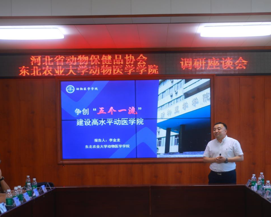 李金龙在会上致辞。他表示对双方的合作充满期待,并认为此次座谈会是双方深化合作、共同发展的重要契机。为此,李金龙还详细的向河北动物保健品协会的代表们介绍了学院发展的整体情况。他表示,学院的发展始终以争创“五个一流”、建设高水平动医学院为目标,从教育教学水平、师资队伍、教书育人成效、党建、科研、思政、实践平台、人才培养成效、重点实验室和十四五科研平台等方面取得的成就和突出进展进行一一介绍。同时,他还表示,希望河北动物保健品协会的企业家们能为我校优秀人才提供更为广阔的发展平台。