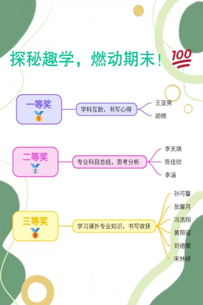 为激发同学们的学习热情,让同学们体会到学习乐趣,12月7日,学院学生会第二课堂活动部开展“探秘趣学,燃动期末”知识大冒险活动。活动形式多样,参与者随机抽取奖项,每个奖项分别对应需要完成的学习任务,包括专业学科互助、专业知识总结、阅读专业课外资料、英语单词打卡等。活动共27人参与,2人获一等奖,3人获二等奖,6人获三等奖。