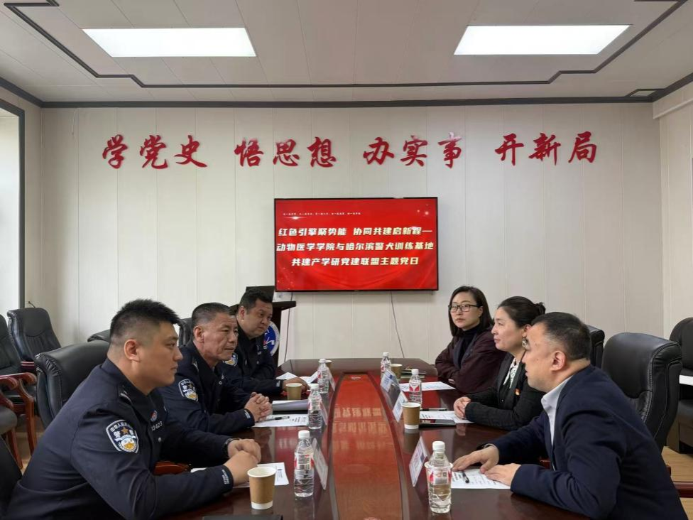 为深化党建引领下的警地协同发展,推动产学研用深度融合,2025年5月7日,必威西汉姆官网平台与哈尔滨警犬训练基地联合举办“红色引擎聚势能 协同共建启新程”党建联盟主题党日活动。哈尔滨警犬训练基地副主任唐景宇、丁雪松,繁育队队长郜旭,必威西汉姆官网平台党委书记张春燕,院长李金龙,副院长乔薪瑗参加活动,会议由李金龙主持。