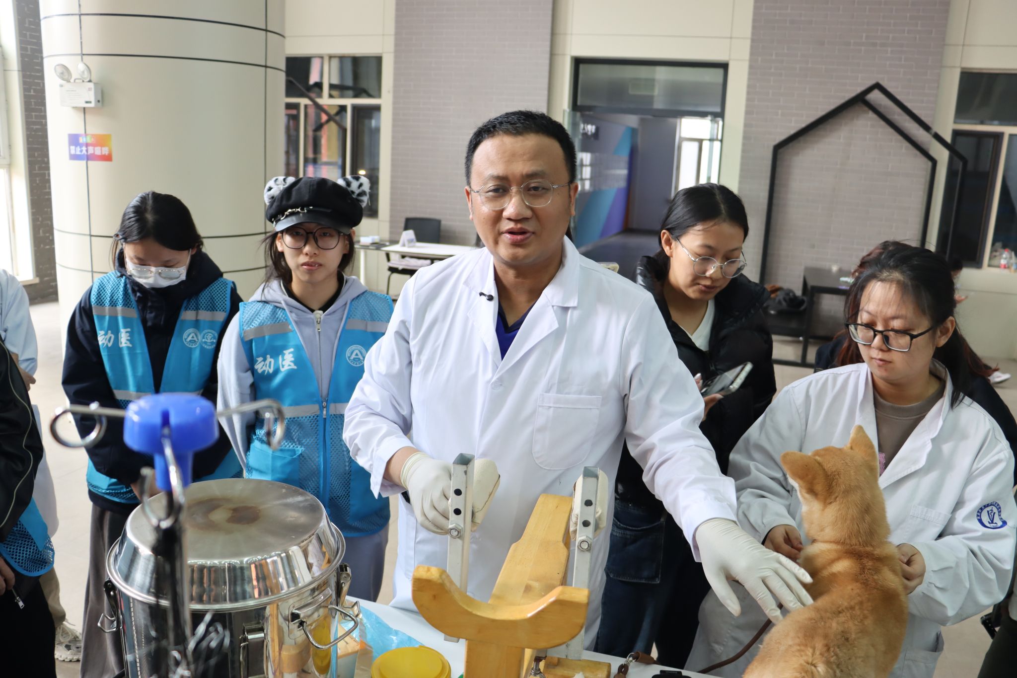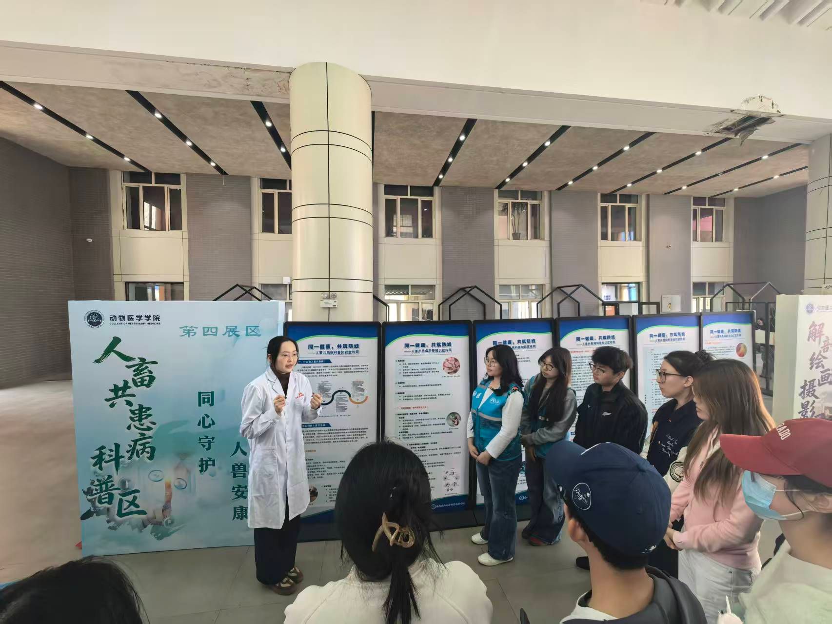 本次文化节围绕专业与人文主线,设置了五大特色展区。在第一展区萌宠疗愈区,小兔子、荷兰猪、小仓鼠等温顺动物与来访者亲密互动,通过动物辅助疗愈缓解学业与生活压力,同时传递了“温柔互动、拒绝随意投喂”的科学养宠理念;第二展区中兽医展区现场展示了针灸、推拿及中药制剂在现代动物诊疗中的应用,呈现传统兽医学“望闻问切”的独特智慧;第三展区标本诊疗区集中陈列了动物解剖标本、手术器械及兽药标本,参观者可近距离观察骨骼、器官模型,了解常见手术器械的用途,走进兽医临床的真实世界;第四展区人畜共患病科普区针对狂犬病、弓形虫、布鲁氏菌病等重点疾病,以图文展板与志愿者讲解相结合的方式,普及科学防护知识,倡导文明养宠行为;第五展区解剖绘画与摄影展区展出了学生“医路逐光”摄影比赛及解剖学绘画大赛的获奖作品,一幅幅画作、一张张照片记录着动医学子对生命的理解、敬畏与热爱。