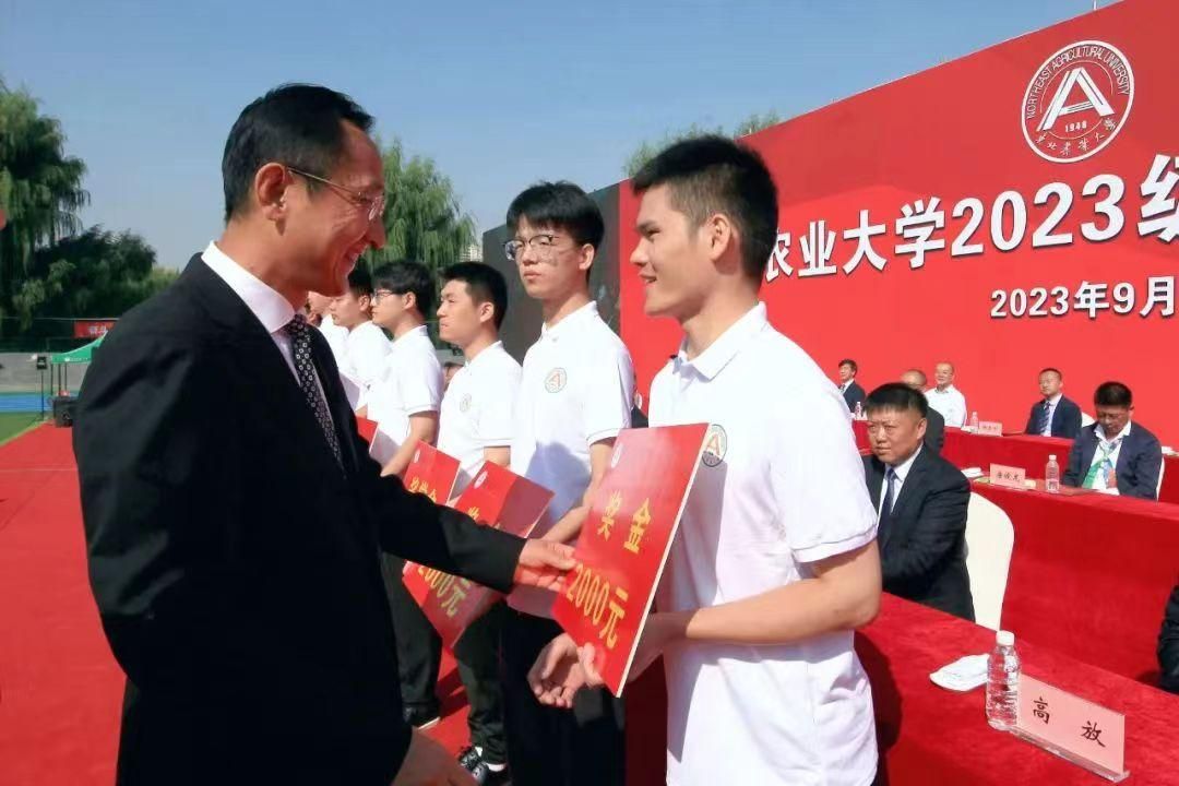 典礼上,校党委书记李长生为我院见义勇为的新生姚烨城、胡豪杰颁发奖金。今年4月,在黑龙江省哈尔滨市防洪纪念塔江边,一名老人不慎落水,危急时刻,姚烨城、胡豪杰等三名同学临危不惧、有勇有谋,合力断金、接力救人,最终,老人被成功救上岸,各大媒体对此事进行了报道。他们也得偿所愿,顺利考取东农动医学院研究生,他们表示,在未来的研究生学习中,将会一步一个脚印,高质量完成实验与学业。