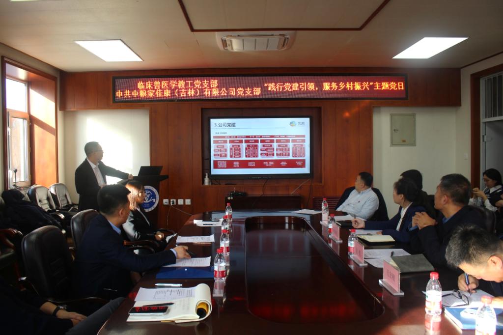 张春燕在会议上讲话,她对中粮家佳康(吉林)有限公司一行的到来表示欢迎,对公司在以党建为引领助力脱贫攻坚、服务乡村振兴、带动农民致富等方面开展的一系列工作、取得的优异成绩和成熟的经验做法表示赞赏。希望以后会有更多的机会与公司分享交流可复制、可推广的党建经验。张春燕介绍了我校党建工作的基本情况,对临床兽医学教工党支部在发挥党支部战斗堡垒和党员先锋模范作用、服务乡村振兴上开展的高素质农民和农村实用人才培训、建立“一对一”合作关系,深度服务“兴边富民”战略和选派优秀党员进行驻村定点帮扶等工作取得的成绩给予了认可。她表示,学校各基层党组织在学校党委的领导下,将认真贯彻落实中央、省委和省委教育工委关于实施乡村振兴战略的部署要求,始终坚持“立足龙江、面向‘三农’、发挥优势、积极服务”的宗旨,充分发挥学科优势,为助力龙江全面振兴全方位振兴作出应有贡献。希望学院与企业以党务共建为契机,在党建和业务工作上开展深度合作,以高质量党建引领和推动业务工作全面提升。
