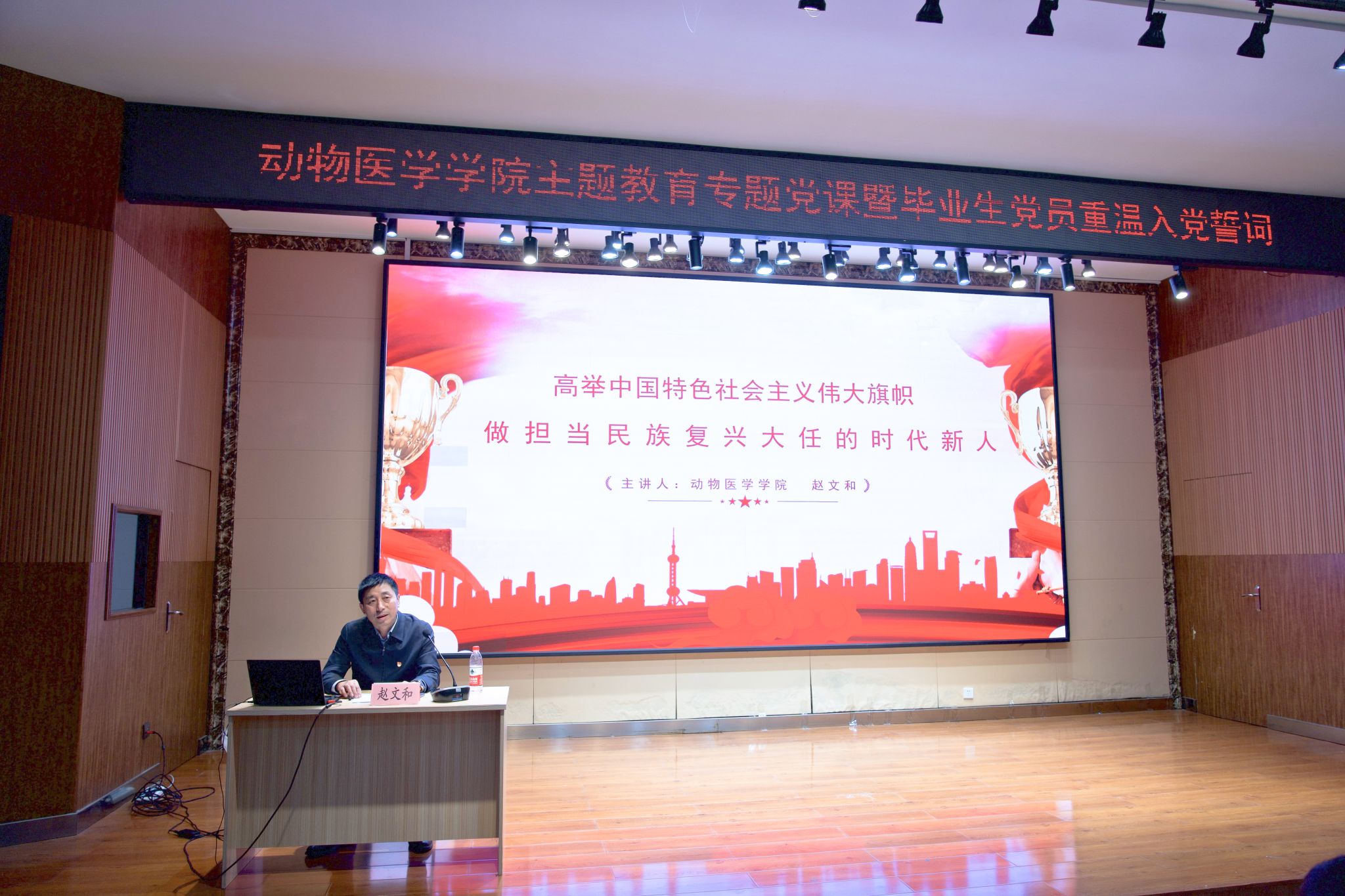 赵文和作了题为《高举中国特色社会主义伟大旗帜做担当民族复兴大任的时代新人》的党课。党课介绍了许振英、蒋亦元等老一辈东农专家勤耕不辍的科研精神;展示了兽医9位奠基人的卓越功勋;结合时政,诠释了中国式现代化的内涵;叮嘱同学们要听党话跟党走,学好用好专业知识,开阔眼界和格局;以生动的案例,解答了“以什么样的作为助力龙江现代化建设”、“以什么样的姿态彰显东农力量”两个问题。并对毕业生党员提出了四点希望:一是要继续掌握和扎实理论功底。无论是步入社会还是继续深造,都要博览群书,增强理论武装。二是要在应用专业技术方面起创新驱动作用。无论是从生产发展、从学科发展的需要出发,都要立足岗位、善于实践,发挥学科优势,运用所学知识,造福社会。三是要培养社会交往能力。把握交流机会,做到诚实守信,人格平等。四是要培养沟通能力和团队精神。要有全局意识、大局观念,要有宽容与合作的品质、敬业的品格。