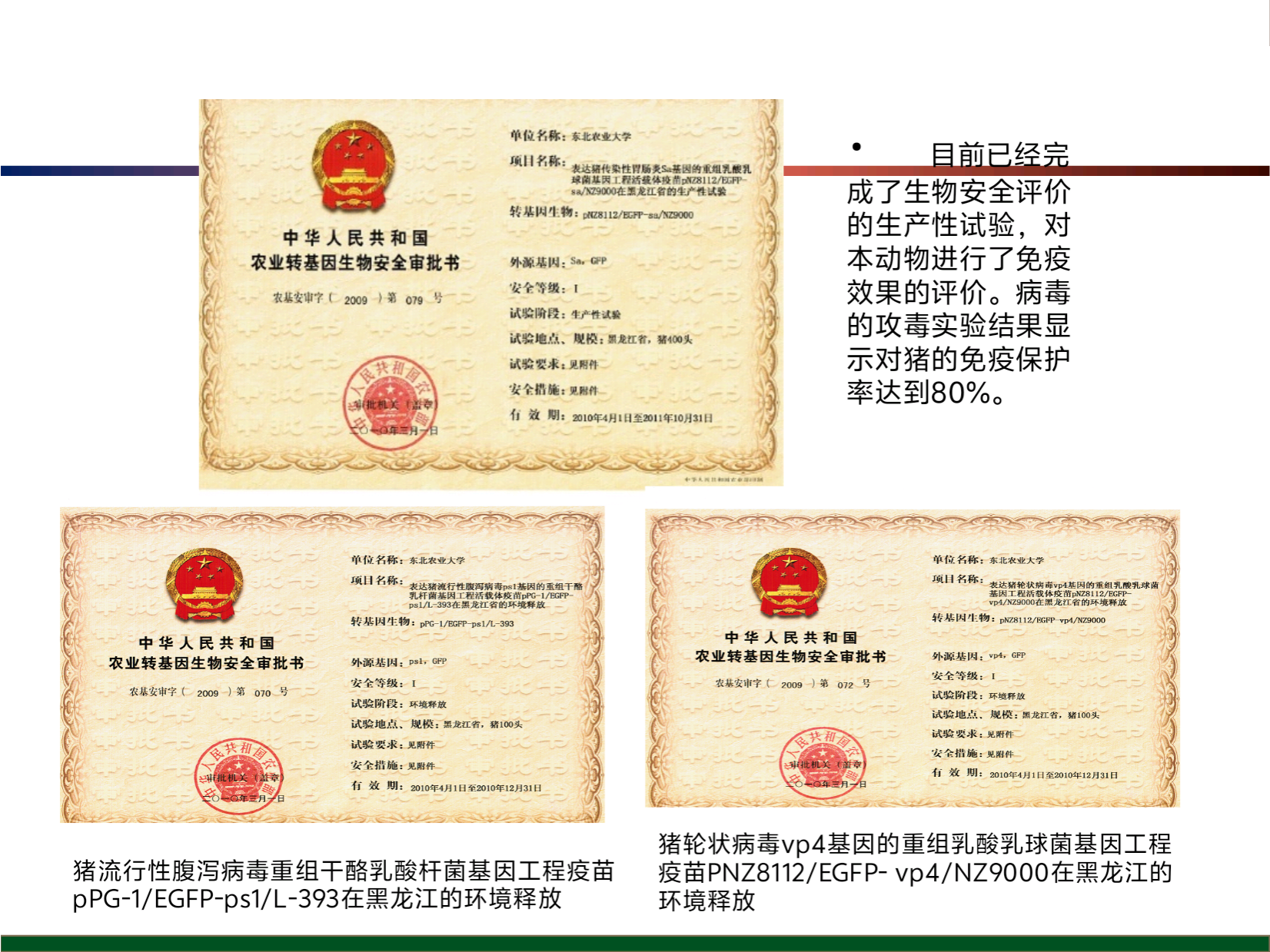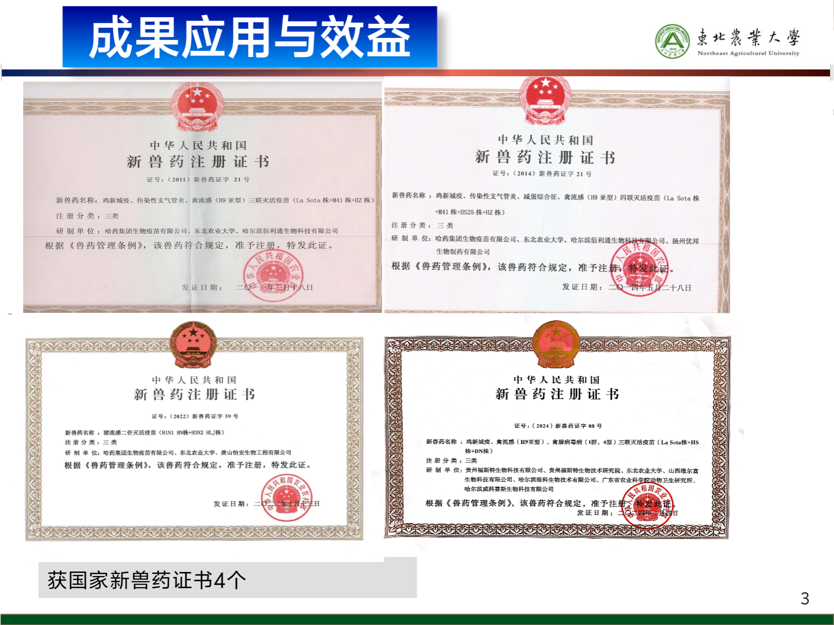 2021年培养毕业研究生4名,招收博士和硕士5名,完成了牵头主持“十三五”国家重点研发项目“动物重大疫病新概念防控产品研发”的课题验收工作,评审专家组一致同意评审通过;完成了国家自然科学基金项目“表达猪腹泻冠状病毒保护性抗原转基因乳酸菌诱导黏膜免疫的研究”结题工作,在国际专业学术期刊发表文章4篇;以参加人身份获得黑龙江省科技发明二等奖1项。