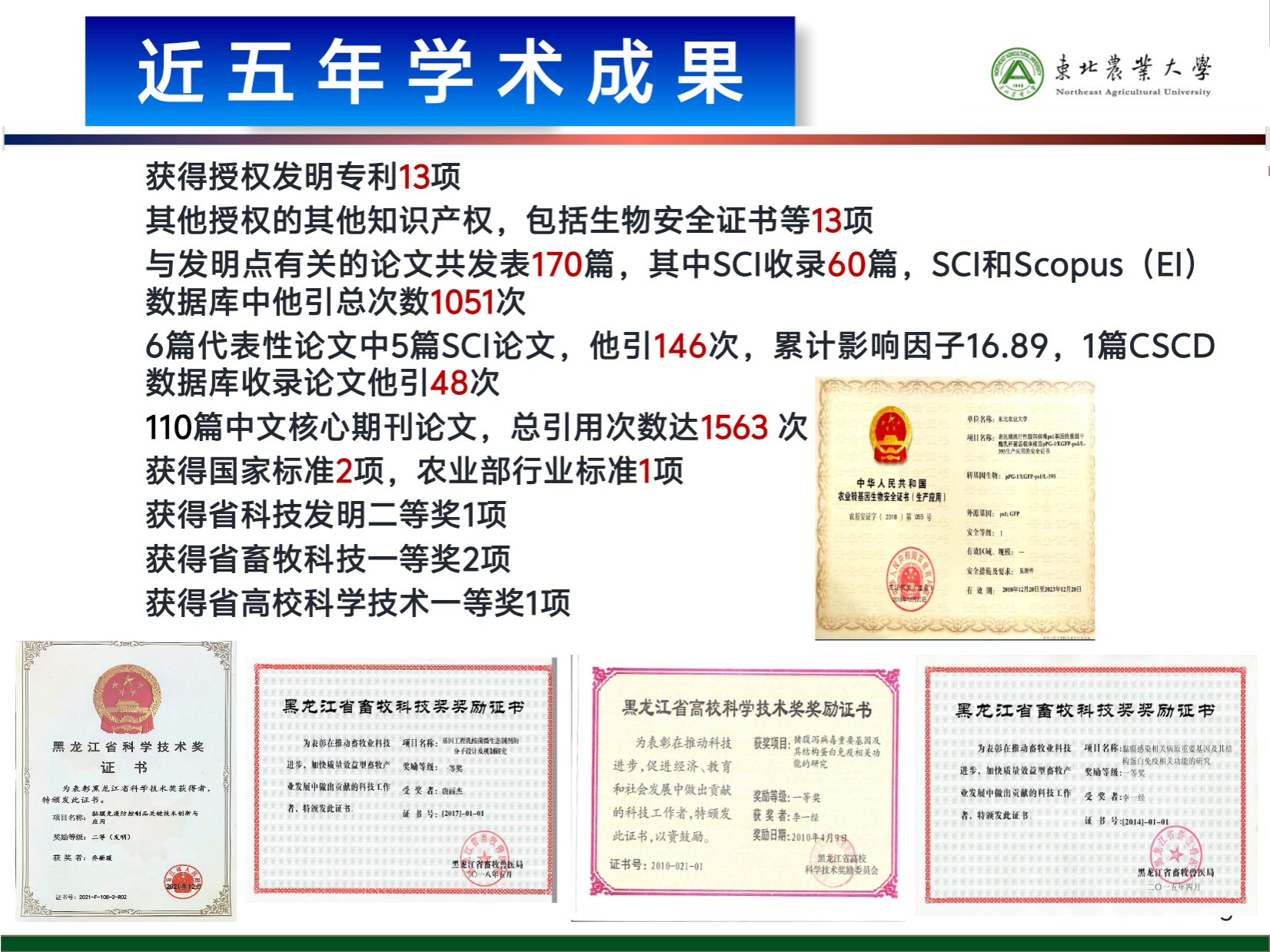 获得黑龙江省自然科学技术奖二等奖一项。获得科研项目12项,其中国家级2项(均为国家自然科学基金),省部级3项(其中黑龙江省自然科学基金重点项目1项,黑龙江省自然科学基金优秀青年基金1项),厅局级1项,横向课题6项,总计486万元。发表科研论文132篇,其中SCI收录论文109篇,EI收录1篇,中文核心论文23篇。SCI收录论文中,一区论文25篇,二区论文61篇,ESI高被引论文3篇,Top论文48篇。主编、参编专著和教材5部。获得国家发明专利2项。张志刚教授入选国家重大人才工程青年学者,徐世文教授获得科睿唯安2021年度全球“高被引科学家”称号,张子威教授获得黑龙江省优秀青年人才称号。此外共有4名团队成员获得省部级以上荣誉称号,分别获得首届全国教材建设奖先进个人1人、黑龙江省优秀共产党员1人、中国兽医协会全国杰出兽医1人、思政课程建设先进个人1人,另有4位研究生获得中国兽医协会第九届兽医大会兽医希望之星称号。培养博士毕业研究生10名,硕士毕业研究生42名。选派16名博士硕士研究生参加会议,并作会议报告。