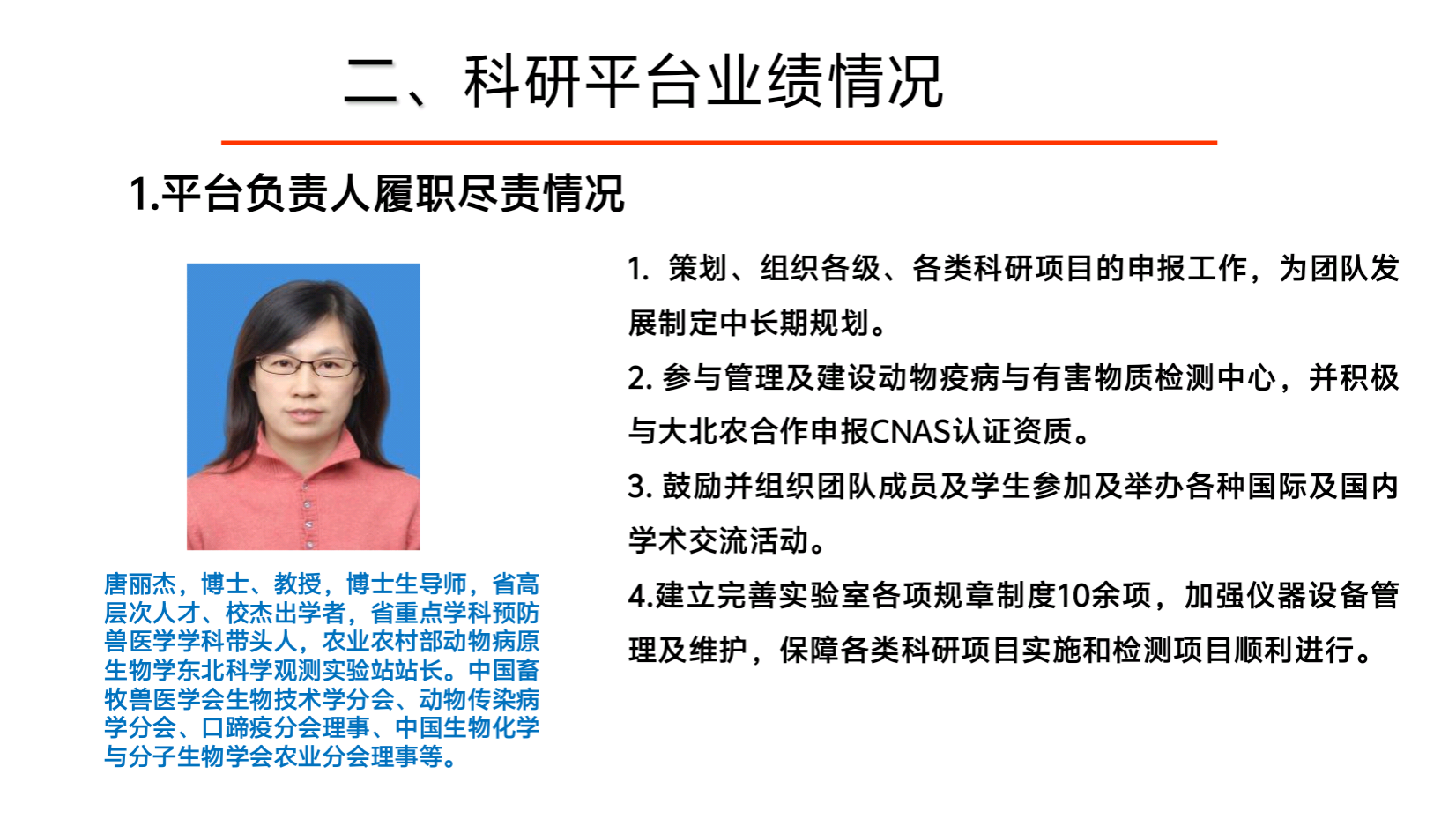 主要研究方向:兽医基础理论、畜禽重大疾病发病机制、关键防控技术、防控产品研发和新兽药创制等领域开展教学、科研和成果转化工作。