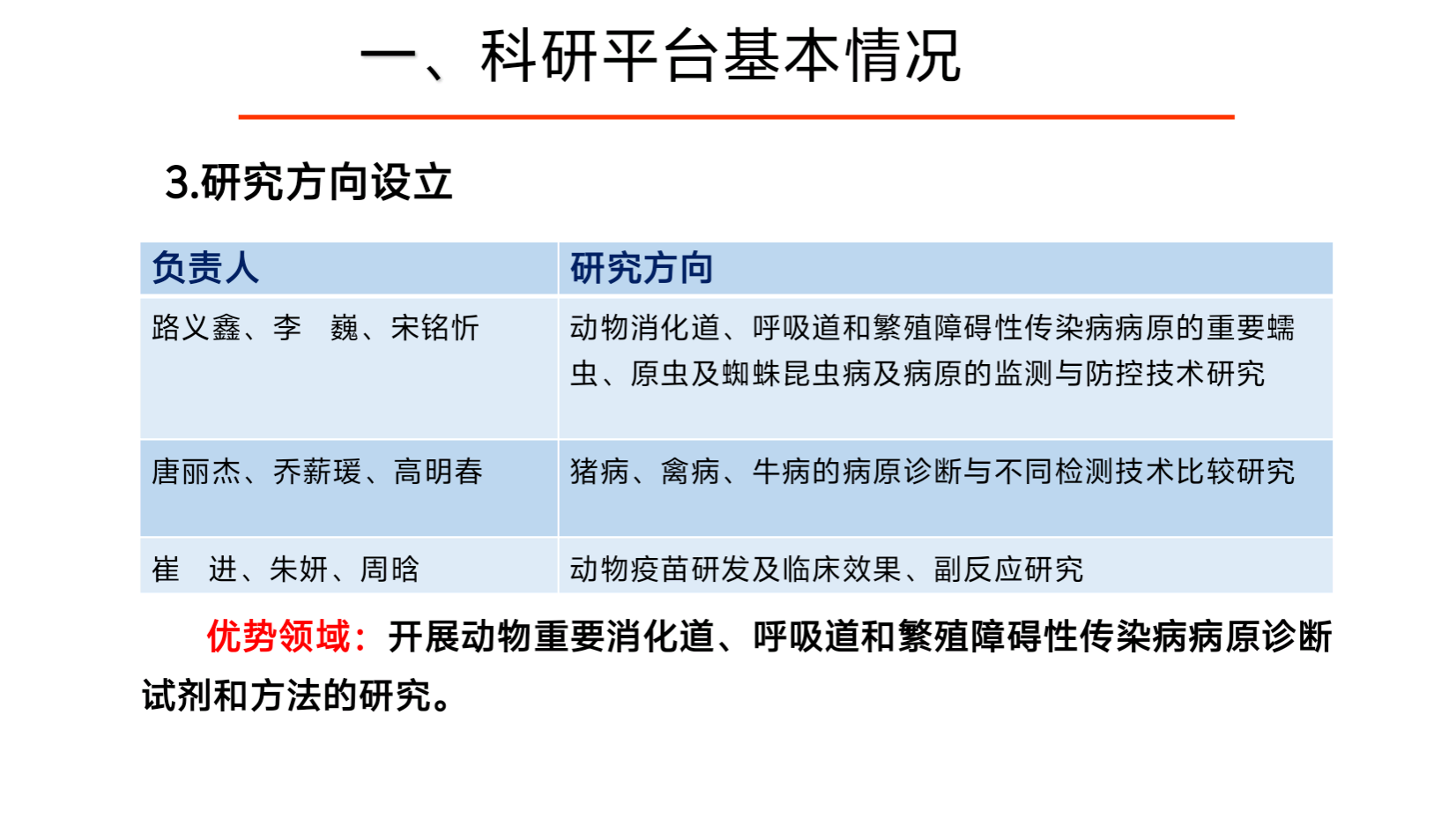 实验室定位:本实验站作为重点实验室的延伸,定位于科学观测。其中包括病原的监测、诊断与检测技术开发、疫苗临床效果与药物残留观测等。根据上级重点实验室确定的主要研究任务和重点方向进行科学观测,数据采集,共享数据。