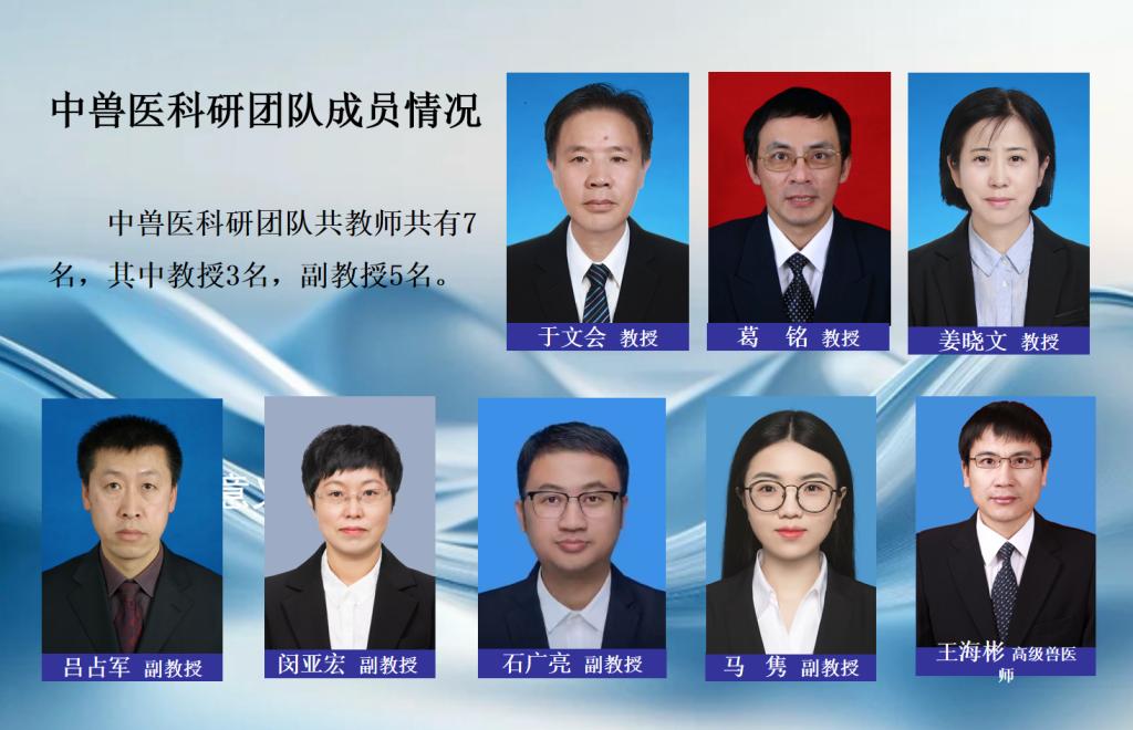 bw必威西汉姆联中兽医学科研团队共有8名成员,其中教授3人,副教授5人。团队负责人于文会,团队骨干姜晓文,马隽,石广亮,成员:葛铭,吕占军,闵亚宏,王海彬。团队主要研究方向:中药防治畜禽疾病。